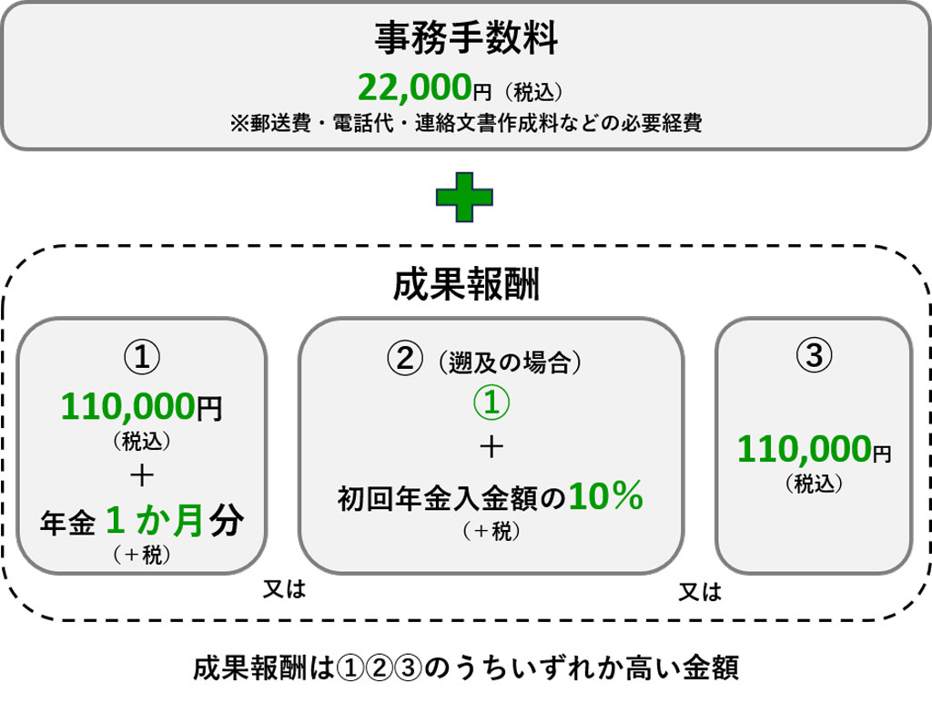 | 成果報酬① | 110,000円(税込)+年金の1か月分(加算分を含む)相当額+税 |
